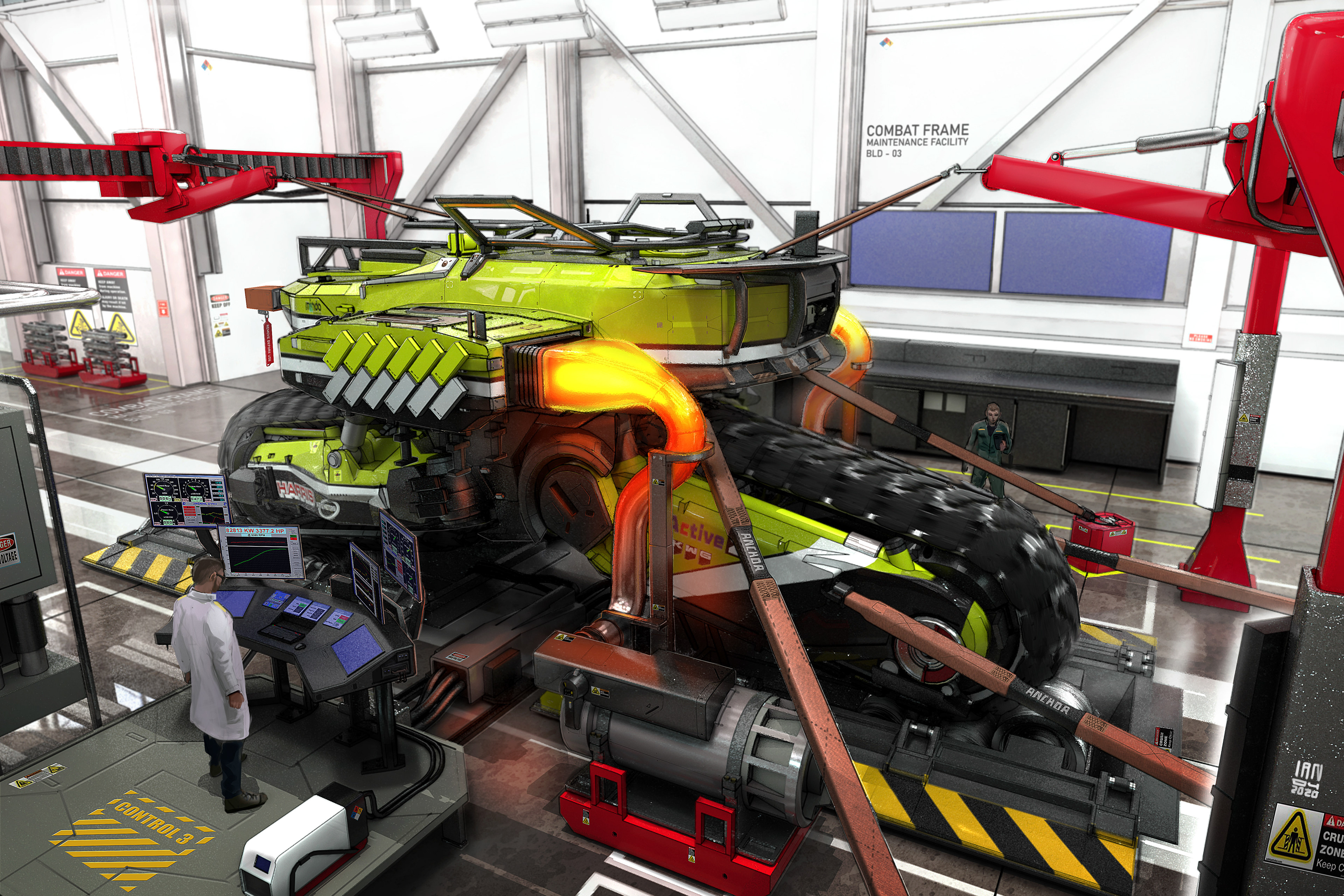 The massive rolling road was developed in Germany and shipped halfway across the globe to the maintenance facility. It was originally built for large scale unmanned construction vehicles but it has been repurposed to run at a much greater speed. Many of the Frames are able to reach speeds in excess of 200kph with their multi-material treads. The exhaust heat generated by the BT-27 shown here is somewhat of an anomaly, the power train is a tightly held secret and we will have to make our own assumptions, but seeing as how they’re using two military grade Optima class heat sinks it’s safe to assume they’ve made some power gains.